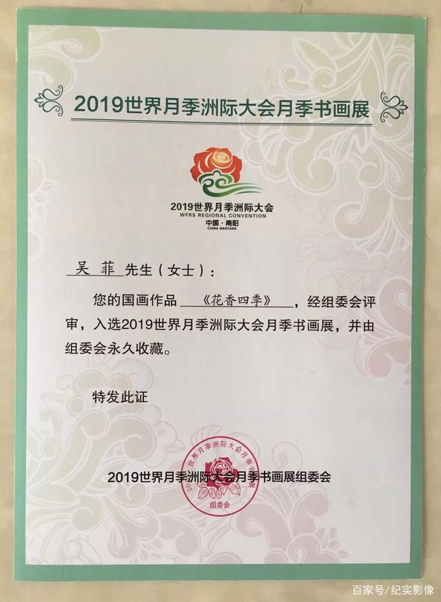吴菲创作的国画作品巜花香四季》经组委会评审、入选2019年世界月季洲际大会月季书画展。