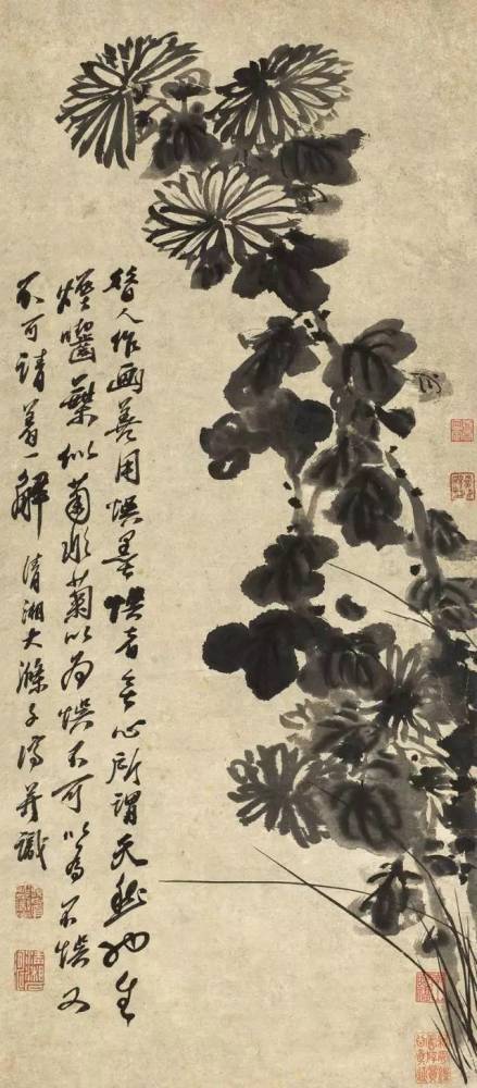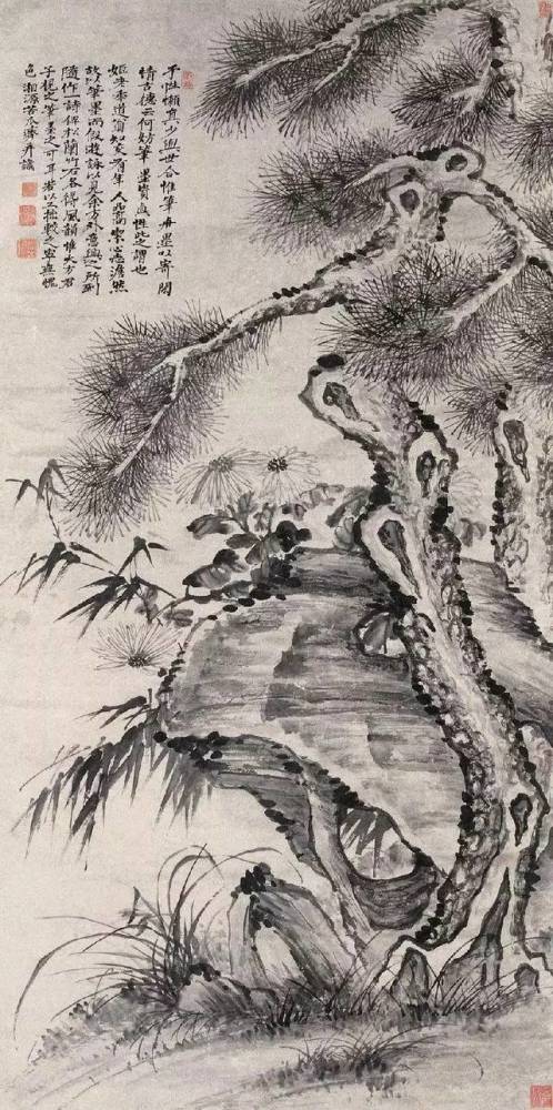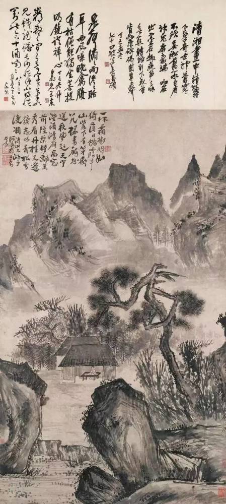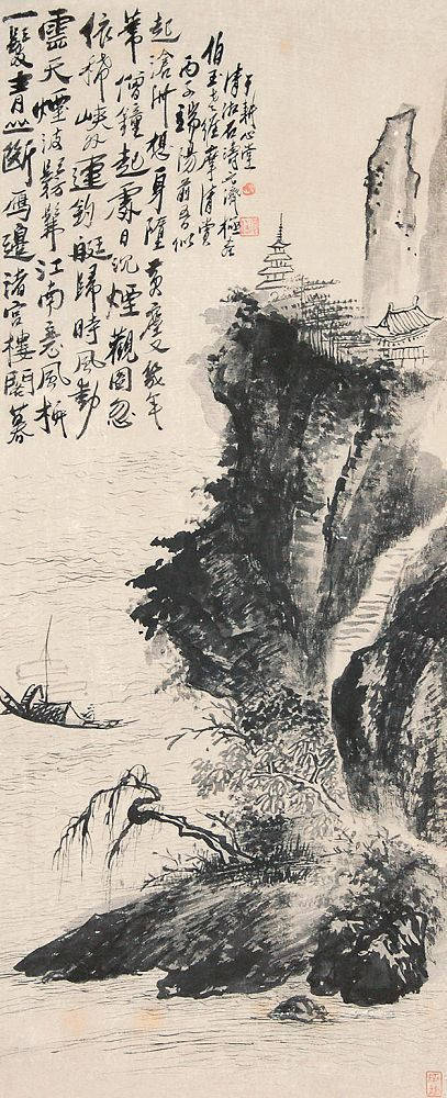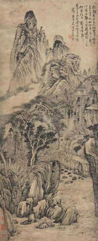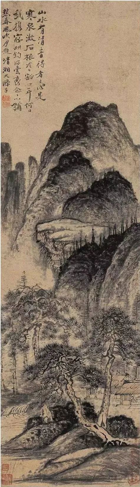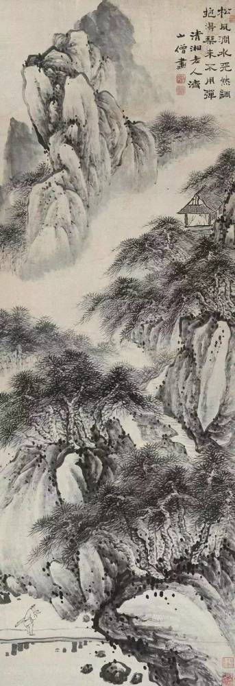 石涛工诗文,善书画。其画擅山水,兼工兰竹。其山水不局限于师承某家某派,而广泛师法历代画家之长,将传统的笔墨技法加以变化,又注重师法造化,从大自然吸取创作源泉,并完善表现技法。作品笔法流畅凝重,松柔秀拙,尤长于点苔,密密麻麻,劈头盖面,丰富多彩;用墨浓淡干湿,或笔简墨淡,或浓重滋润,酣畅淋漓,极尽变化;构图新奇,或全景式场面宏阔,或局部特写,景物突出,变幻无穷。画风新颖奇异、苍劲恣肆、纵横排奡、生意盎然。其花鸟、兰竹,亦不拘成法,自抒胸臆,笔墨爽利峻迈,淋漓清润,极富个性。石涛的绘画,在当时即名重于世,由于他饱览名山大川,“搜尽奇峰打草稿”,形成自己苍郁恣肆的独特风格。石涛善用墨法,枯湿浓淡兼施并用,尤其喜欢用湿笔,通过水墨的渗化和笔墨的融和,表现出山川的氤氲气象和深厚之态。有时用墨很浓重,墨气淋漓,空间感强。
