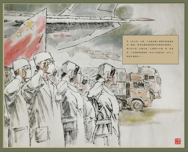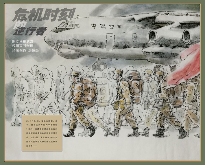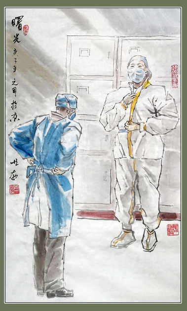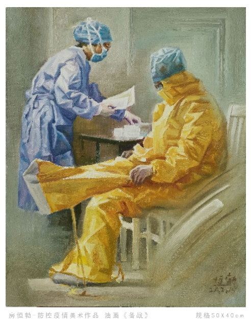 医护人员身着厚重的防护服,却能快步疾行,只是为了患者能早日无恙。他们经常日夜相继,有时只能和衣斜躺,小憩后又精神抖擞地去守护别人的安康。当著名画家房恒勃看到这一幕幕景象,便决意用手中的画笔记录下医护人员义无反顾踏上前线征程的样子,忙碌、紧张地救治病患的样子,互相鼓舞、打气的样子......无论你们是哪种样子,在全国人民的眼中都是最美的样子!