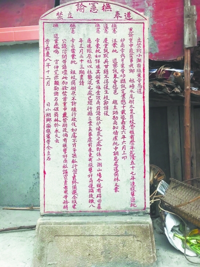 在福建三明大田县石牌镇小湖村的民居中间,竖立着一方清代禁砍盗卖林木烧炭的石碑,立碑人为乐姓全族村民,时间在清嘉庆八年(1803年)十二月。
