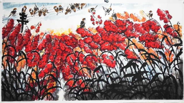 从以上这个角度来讲,他的大写意花鸟作品直接站在了传统文化的根源上,循根源立根本 ,让他的作品多状如狂狷崩裂,有形式感的雄迈,寓意不屈不挠的心性于其中恰当而自然。每作一线都是筋骨雄强的意境,传统的文化精神与当代的形式美感碰撞融合在一起,让崔国安成为当代画坛的一位大写意能家,在借古开今的塑造上,他的创作成绩是独树一帜的!