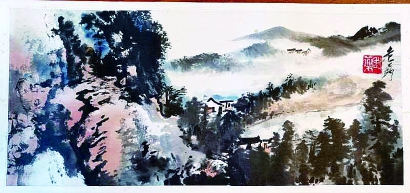 这是一幅山水画手卷,由海上“花鸟四大名旦”之一的陆抑非题写引首;陆俨少、王伯敏、刘慎旃为之题跋,挺拔的字迹与画迹相映成辉,二者浑然一体。画上未署创作时间,但据画家唐逸览老师考证是其父1980年代中期所作。画的尺幅虽小,只有36x16cm,但画面山峰坡石,茅亭临水,杂树参差,水天一色,构图很是缜密。在画中,唐老先生用泼墨赋彩和点染积墨之法,独具风格。山水近景有若干古树,重墨勾干写枝,填色赭石,中间空白处显云雾气象,古树下屋舍二间。远处高山水墨粗笔勾勒,焦墨皴擦染色赭石略带花青,数间小屋隐显于云雾缭绕之中。作品很好地描写出了秋山烟雨的湿润、静谧和山中浮动的云雾。此图构思平中见奇,近取其质、远取其势。笔墨有枯有湿,有实有虚,繁而不乱,这幅作品虽然极小,但看起来却似乎有大画的雄伟气魄。这种气魄不是借助粗犷的大笔浓墨来取得的,而是来自它的内在。笔墨则是浑厚华滋,构图疏密得意,一气呵成,无懈可击。充分表现出了《秋山晚晴图》之美,湛为精品佳作。