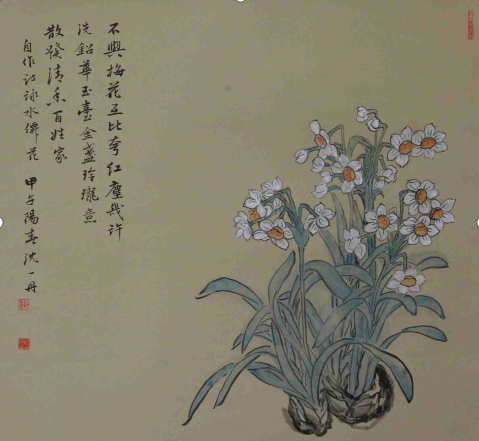 2014年春,她画了一幅《水仙图》,落款题了一首《咏水仙花》:不与梅花互比夸,红尘几许洗铅华。玉台金盏玲珑意,散发清香百姓家。水仙花洗尽铅华,高洁清芬,但不与梅花争奇夺艳,百般玲珑之意,在百姓家中散发着自己的清香。这首诗诗意浓郁,有意境,仿佛是自己的写照。题款的字工稳中寓秀逸,沉实中含劲朗,与芬芳清新,素洁幽雅的水仙花,相映成趣,洋溢着浓郁的审美情趣,凸显出超凡脱俗的内在心境,是一幅诗书画合一的佳作。