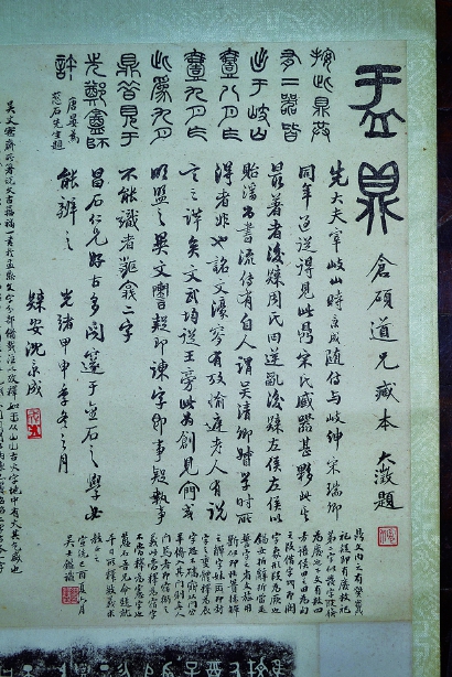 在沉寂了近百年后,2003年上海博物馆自海外成功收购帖祖《淳化阁帖》后,激发了民间碑帖收藏的热情,又在国内外碑帖拍卖市场的助推下,迎来了碑帖收藏的又一个春天,各地传拓碑帖也陆续恢复,网上微拍碑帖生意兴隆,碑帖题跋渐成风气。不久前,在童晏方老师的指导下,唐存才、虞伟两先生在艺苑真赏社策划了一个“古韵今尚金石碑帖题跋展”,展品全部出自上海民间私藏,一定程度上,反映了当下海派金石收藏的旧有底蕴和新启时尚。展览上有一件藏品,集中体现了金石文化的永恒魅力,它就是海上金石领军人物——吴昌硕旧藏《大盂鼎》。此鼎清道光初年在陕西郿县礼村出土,初归岐山豪绅宋金鉴所有,后为岐山县令周赓盛豪夺霸占,再转手倒卖给省城文物商。道光三十年(1850),宋金鉴得点翰林后,在京师琉璃厂重见大盂鼎,旋即出银三千两将其重新购归,运回岐山老家。同治初年,宋家家道中落,大鼎转归项城袁保恒(袁世凯叔父)。同治十二年(1873),左宗棠又从袁保恒处购得此鼎,暂存关中书院。昔日左宗棠曾遭人弹劾,后得潘祖荫疏救而幸免,遂决定以此鼎相赠,以示感激。同治十三年(1874)大盂鼎入藏潘祖荫府邸。潘祖荫旧藏大盂鼎,是西周青铜器中的“重器鸿宝”,与大克鼎、毛公鼎并誉为“海内三宝”。