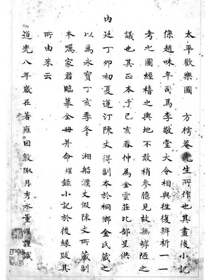全书末尾附有董燿的题跋,交代了摹本的来龙去脉。从中可知,嘉庆十二年(1807)初夏,居濮院的陈铣(1785-1859)从桐乡金家得到方薰副本,打算藏之以为永宝。道光七年(1827)冬,濮湘船从陈铣处借出副本,让曾为方薰弟子的董棨临摹全册,并嘱咐董燿录小记于书后。这个版本还有一个特点就是每幅画页左下均钤有董棨的印章,且各不相同。董燿的跋语中除了提到方薰作画之外,还记录了画后小记为赵味辛(赵怀玉)、李敬堂两人手笔。
