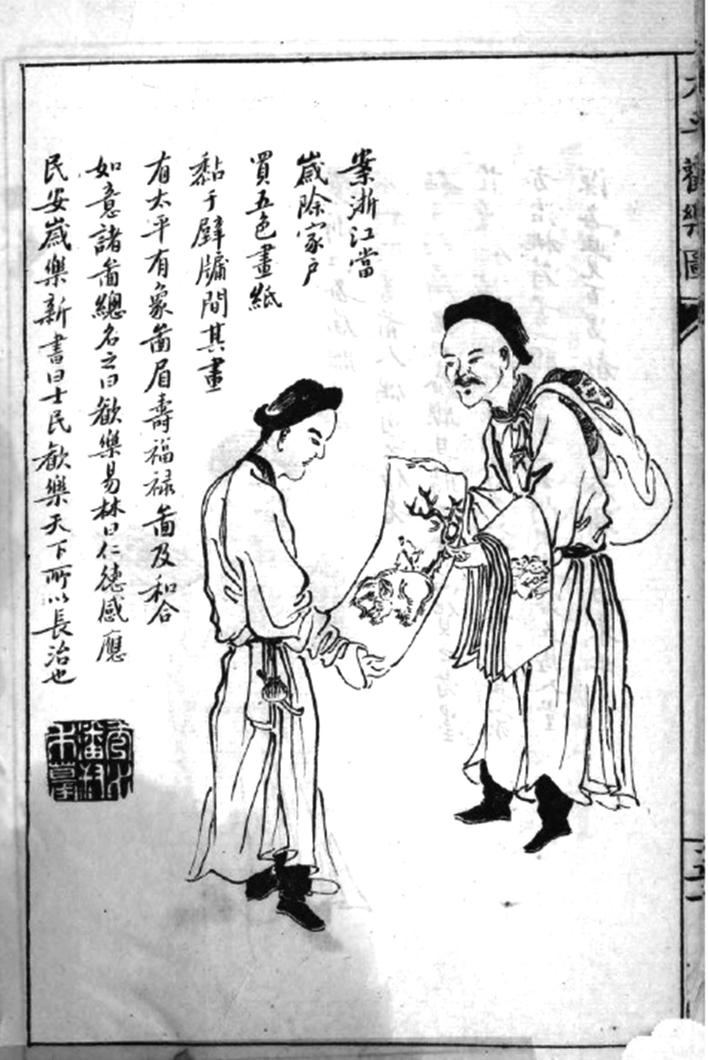 董棨的摹本之外,流传最广的就要数光绪十四年(1888)上海积山书局刊印的石印本《太平欢乐图》了。该刻本前有钱塘人吴淦的序言,其中说到此版本是潘振镛、潘振节兄弟俩“搜得副本,付诸石印,说仍其旧,为雅声(即潘振镛)所书”。而该册的最后一页“除夕欢乐图”左下角有“秀水潘叔禾(即潘振节)摹”印,可见石刻本也是一种再创作。石刻本与彩绘本最大的不同之处在于采用了图文合页的形式,文字也没有董燿的小楷那么工整精美。单色印行,自然也不及彩绘本美观,装订方面也是压缩为一本。最重要的差别在于,石刻本和彩绘本的排序大相径庭,至于孰对孰错,暂时还无定论,但可以肯定的是,在流传的过程中,作品已经不再是最初的样子了。另外还有一个问题容易引发争议,潘氏兄弟说搜到了副本,这个副本到底是哪部副本,方薰的还是董棨的?如果是方薰的,那按照前面陈铣绿天书舫遭遇火灾来看,方薰留下的唯一副本应该已在1831年至1836年间被焚毁,那么到了1888年,又何来的副本呢?所以,有可能为了卖书,潘氏兄弟和钱塘吴淦含混其词,只是得了副本的副本而已,比如,董棨的摹本,或者如清人蒋宝龄《墨林今话》中记录的现已散失的归安(今属湖州)画家石渠的摹本,据说他“尝摹方薰《太平欢乐图》,有出蓝之誉”。考虑到石印本与董棨彩绘本在人物形象和页序排列上的巨大差异,潘振节所依据的版本应该不太可能是董棨的摹本。