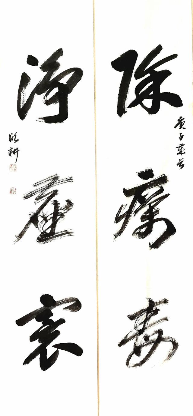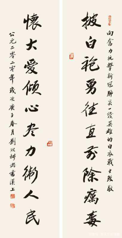 书法对联《披白袍,勇往直前除疠毒;怀大爱,倾心尽力卫人民》