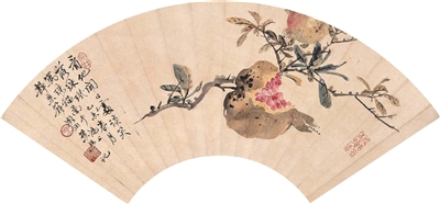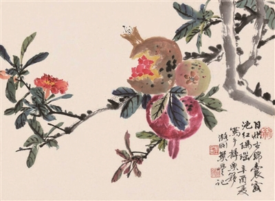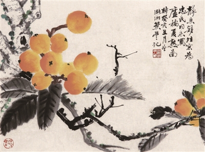 叶翁不仅精于篆刻,其对花鸟画亦颇有造诣,尤善绘花卉果蔬。观其师承,远取明代陈白阳、清代华新罗,近师任伯年、吴昌硕诸家,继而陶冶熔铸,自出个性,作品温醇清雅,着色明丽,风格清新,且为画题、钤印留意位置,等同分行布白,互为呼应。其画作题材多为仙桃及家乡洞庭山盛产的枇杷。尤其是所画枇杷,色泽鲜活、果儿盈硕,充满成熟之美、山乡之美,一眼望去便将人牢牢吸引,故人称“叶枇杷”。