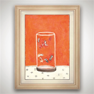 据《常玉油画全集》第一及第二册记载,常玉一生仅有十一幅以“鱼”为题材的油画,四幅现由台北国立历史博物馆永久收藏。而此作中不仅有八尾金鱼,寓意富裕和希望,且前所未有地采用静物绘画方式呈现动态物象主题,铺排则贯彻常玉的花卉和室内场景常见设置,简单纯粹地把圆柱形鱼缸置于花纹布饰的桌面上。纵观常玉所有作品,无论是题材或技法亦没有与之相似,可谓举世无双之作。
