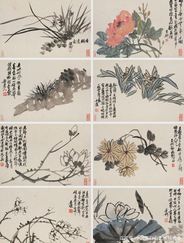 《吴昌硕画集》里语:“我平生得力之处在于能以作书之法作画”,此组《花卉册》,吴昌硕以兰花、水仙、牡丹、石菖蒲、菊花、白玉兰、荷花、梅花入画而成八开册页,舍弃了“形”的羁绊,酣畅淋漓地表现了“意”的魅力。