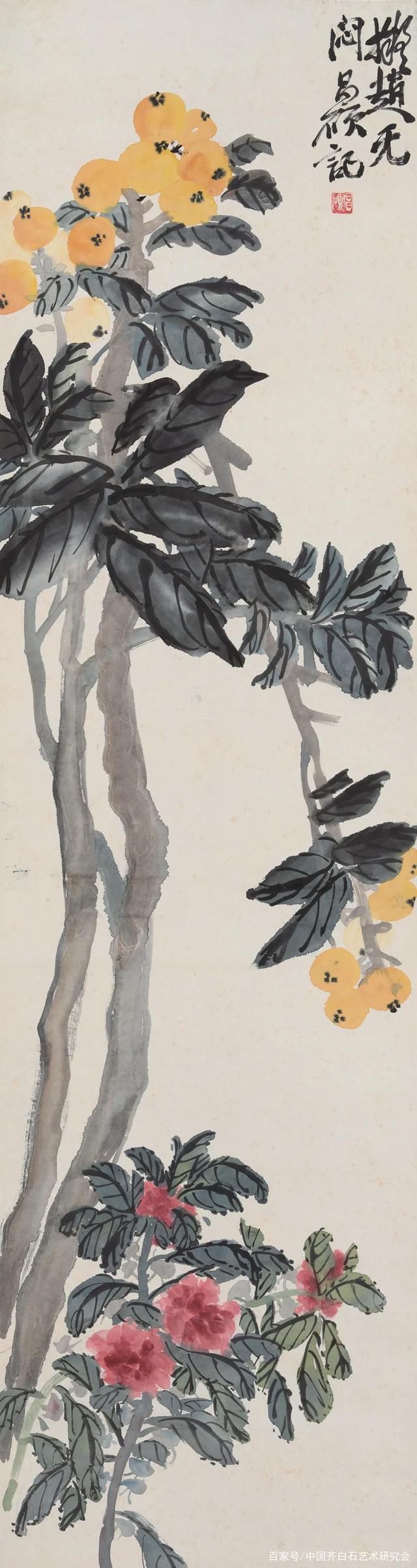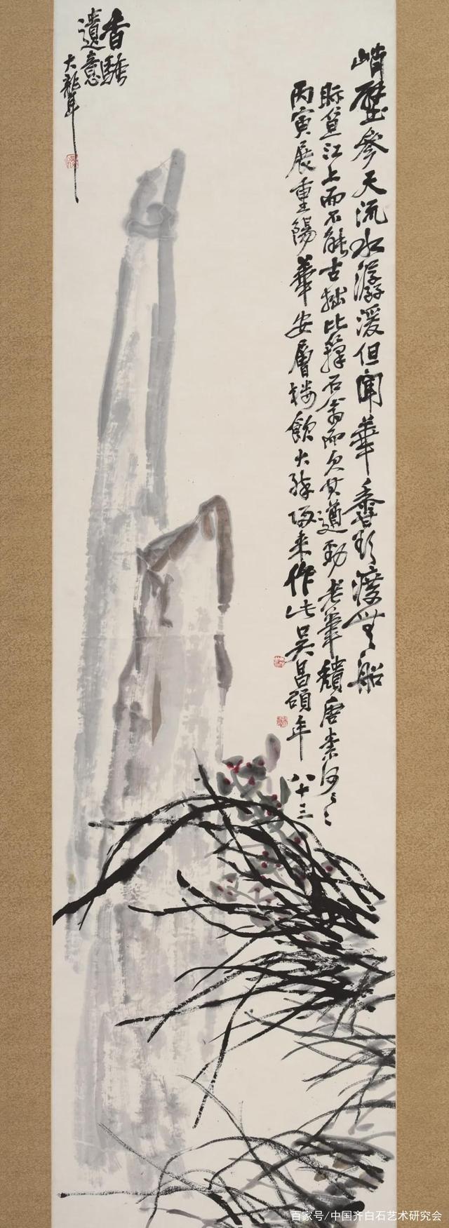 吴昌硕的绘画,“以气势为主,故在布局用笔等各方面,与前海派的胡公寿、任伯年等完全不同。与青藤八大、石涛等也完全异样。”缶翁筑“芜园”,植物颇多,自释“芜”以“草木以芜而生,天地以芜而万物成,人以芜而永保令名”,其率性而为,不事修饰,不拘于时人为准绳,自出机杼,以金石笔意入画。本幅以其善用之对角线构图写珊瑚枝,浓墨缀叶,淡墨浅赭,写苍石草木,疏密相济,形制高大,奇崛之气,纵横满幅,乃其成熟期之作。