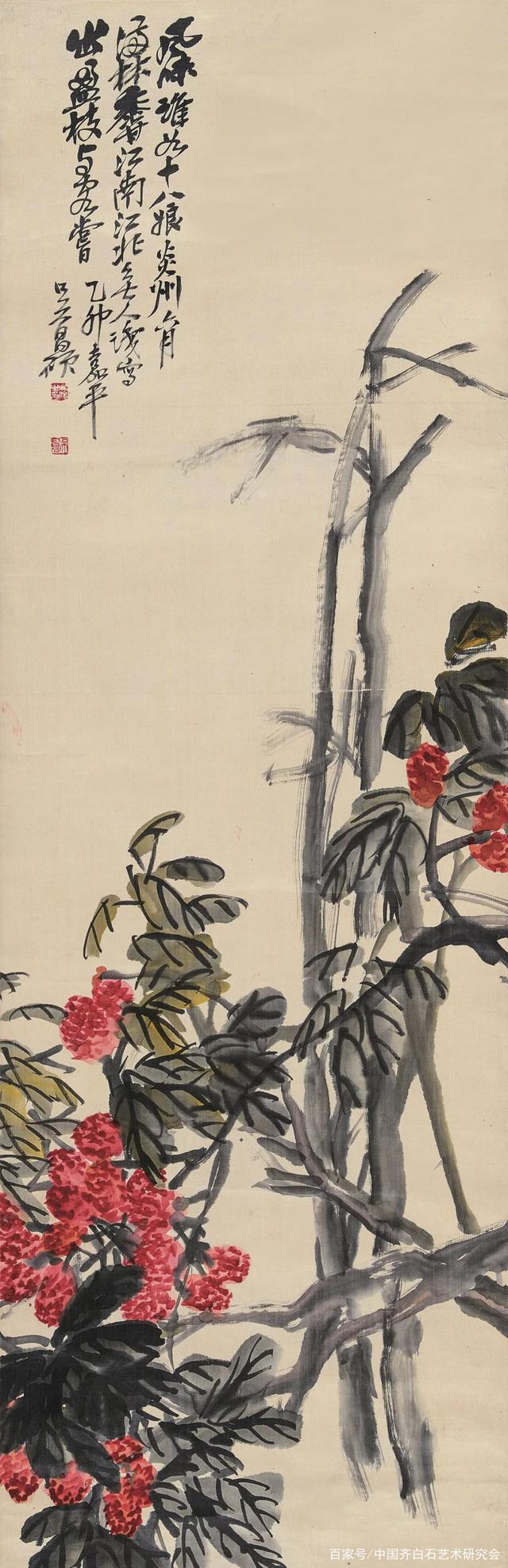 他曾说:“奔放处离不开法度,精微处照顾到气魄。”吴昌硕绘画布局,得益于金石篆刻修养甚多。吴昌硕绘画对色彩运用也能有所创新。他使用的西洋红,深红古厚,配合其得益于金石治印的古厚朴茂的绘画风格,正如潘天寿所说:“以金石治印方面的质朴古厚的意趣,引用到绘画用色方面来,自然不落于清新平薄,更不落于粉脂俗艳,能用大红大绿复杂而有变化,是大写意花卉最善用色的能手。”吴昌硕善用复色,在复色中起制约、协调作用的也是红与黑,并充分利用宣纸的白色。但是他的红色与黑色都是在复色的作用下起着变化,在变化中得到统一,所以使人感到既丰富又沉稳。吴昌硕用重色的斑斓浑厚与其大气磅礴的画面极相协调,是形成他画风的重要因素。吴昌硕绘画的艺术特点,以“苦铁画气不画形”、“不似之似聊象形”为宗旨,以篆法入画,所谓“强抱篆隶作狂草”,极力发挥书法“写”的表现性,以“意造”为法,“惟任天机外行”,以达到“心神默与造化能”的境界,“宣郁勃开心胸”以泄他胸中浩荡之气。乙卯(1915年)嘉平月是农历腊月,荔枝又有大利之意。新年写此,是为对于来年的平安祈愿。