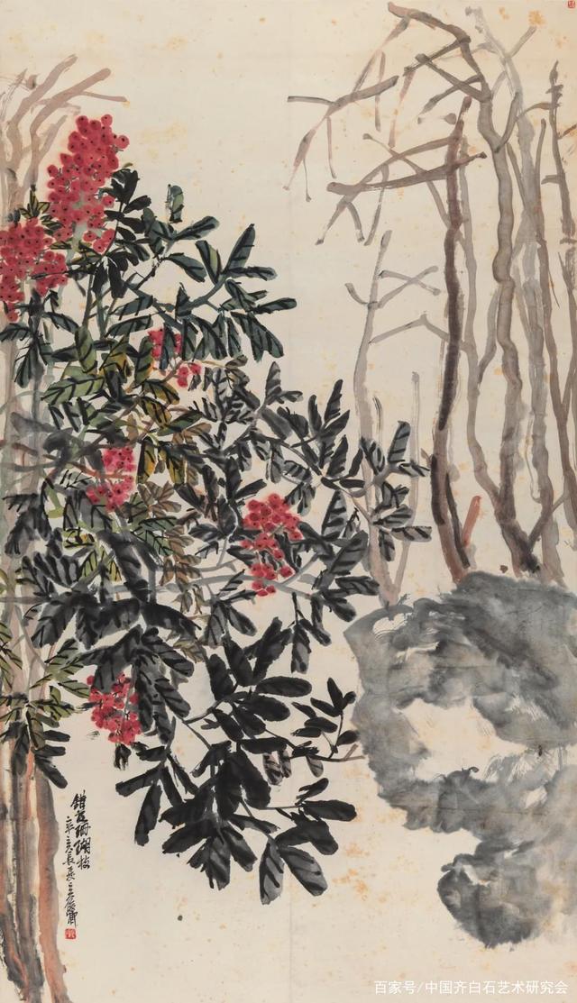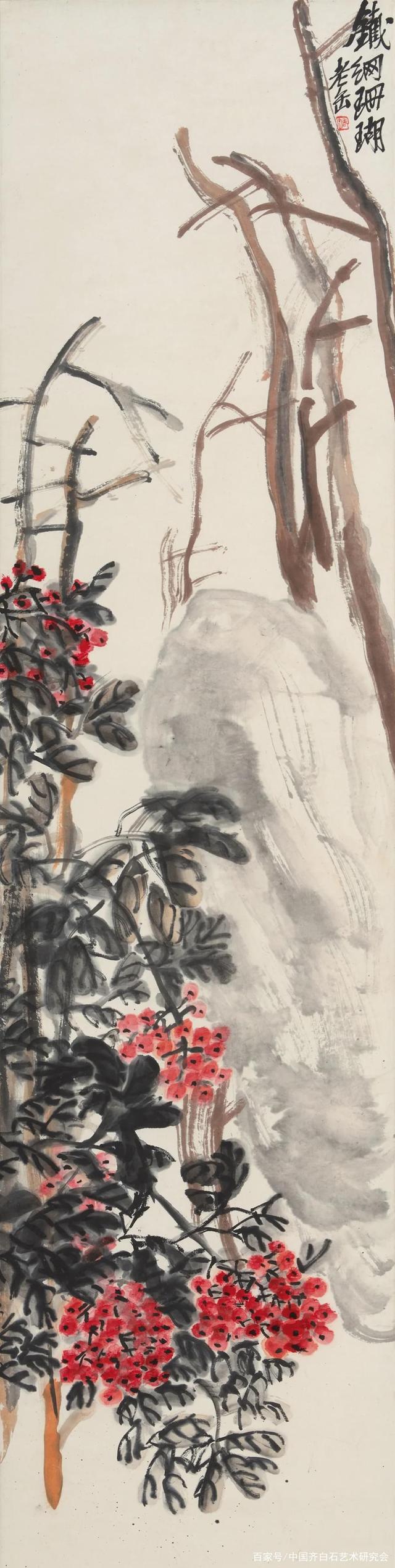 吴昌硕绘画艺术的丰收阶段为其六十五岁至八十二岁,在此阶段,他的书、画艺术可以说已臻炉火纯青的境地,佳作也是最多的时期。吴昌硕善于画花卉,此幅《错落珊瑚枝》为吴氏七十余岁时花卉画之精品,“错落珊瑚枝,铁网出海底”,画面结构严谨,用笔遒劲,吴昌硕善于用线,每枝枝干、每片花叶都似铁杆般坚韧,富有生命力。其构图极为讲究,画家首先用一尊顽石坐落于画面两侧,稳住了画面重心。数枝天竺从顽石后方穿插到画面中心,与树叶形成疏密对比,簇天竺果高低错落、扶摇而上。吴昌硕画花卉,常于繁枝旁点缀以枯枝,以此来增强画面的苍老美感,晶莹剔透的红色枝条与天竺的粗枝大叶相交错,层次丰富,加上行笔老辣厚重,用墨色泽古厚,整个画面顿时苍润烂漫,变化无穷,一种吴氏稳重、典雅、古朴的趣味洋溢其中。