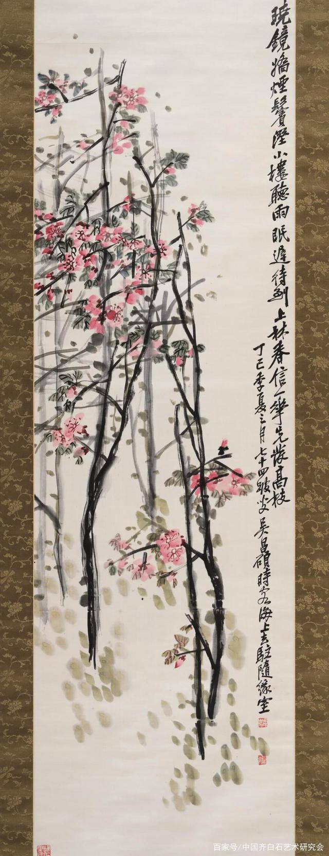 题识:晓镜娇烟鬓湿,小楼听雨眠迟。待到上林椿信,一花先发高枝。丁巳季夏之月,七十四叟吴昌硕时客海上去驻随缘室。