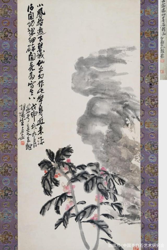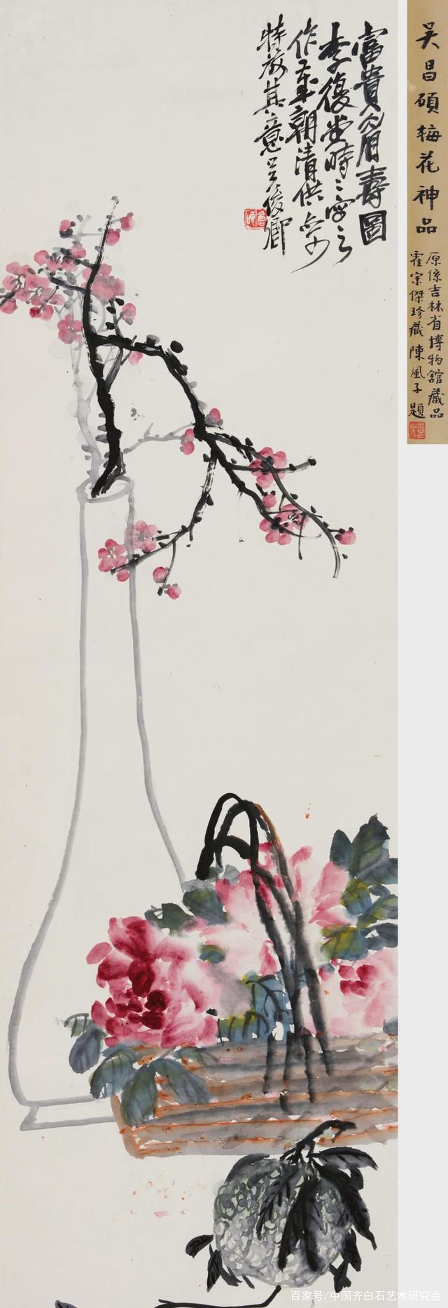 《吴昌硕画集》曾记载“为此春酒,以介眉寿”出自《诗·豳风·七月》,“扬州八怪”之一李鱓(李复堂)常以此入画境,以作岁朝清供、祈福纳祥之意。吴昌硕对于眉寿的理解也在于此。吴昌硕一生酷爱画梅,自称“苦铁道人梅知己”。“以作篆之法写之,师造化也”。他主张画梅取出世姿,要得古逸苍冷之趣,曾有诗云:“卅年学画梅,颇具吃墨量。醉来气益粗,吐向苔纸上。浪眙观者笑,酒与花同酿。法疑草圣传,气夺天池放。”该诗体现了画家突破古法、气度豁达的胸怀。古人云:“唐人尚巧,宋人尚法,元人尚意,明清尚变。”从此画中,我们可以充分感受到吴昌硕“纵横破古法”的艺术追求。其焦墨重彩,老笔纷披,正所谓“笔走龙蛇,左右逢源”也。画面形成大开大合,疏密有致的格局,使咫尺空间神采焕发,洋溢着抒情写意的气息,张扬着中国绘画的写意精神,与历史上的国画梅花大家拉开了距离,形成了自己独特的语言特征。吴昌硕曾这样说过:“小技拾人者易,创造者则难,欲自立成家,至少辛苦半世。”体现出他对艺术的创新有着极其深刻的认识。画面中心的牡丹寓意大富贵,石榴则是多子多福之意。构图采用是中国画美学“不齐觚三角”的构成法则,其内质内涵着“齐而不齐”、“不齐而齐”的会通之美。