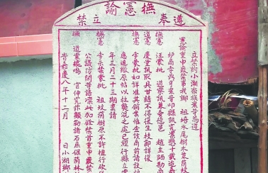 在福建三明大田县石牌镇小湖村的民居中间,竖立着一方清代禁砍盗卖林木烧炭的石碑,立碑人为乐姓全族村民,时间在清嘉庆八年(1803年)十二月。石碑长条形,顶部呈圆弧状。碑体含基座高1.42米,宽度0.72米,一面刻字。