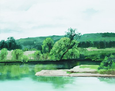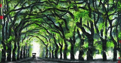 李小可在作品《夏》中描绘了盛夏时节的林荫道。道旁老树有情,在空中交结缠抱,为行人遮蔽酷暑,但浓密的叶子却被毒辣的阳光“融化”着,绿作一团,似胶着在枝干上,形状不再分明。林荫道的尽头,是一团似近似远的留白,不禁让人联想到“白热”一词,本是一种物理现象,这里则变为色彩的语言,使画作多了几分感官上的冲击力。