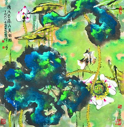 韩天衡的《荷不畏暑》画的是荷塘一角的别样风韵,画面充满了夏日的暑气。画家充分发挥中国画水墨氤氲的效果,将荷叶在酷暑中的身姿动态传神地表现出来,夸张却不跳脱。荷叶用色大胆,使观者在色差中体验到了温差,夏日的焦灼感油然而生。此外,莲花两朵,一开一合,巧妙地点缀在画中,正点了“荷不畏暑”的主题,使得画中之荷似乎有了性格,而夏日的苦热与淋漓之感也跃然纸上。