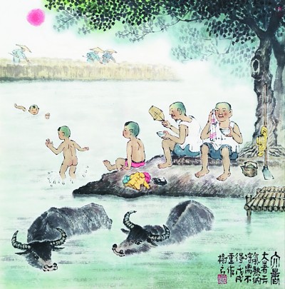 自然之外,大暑时节的人间烟火也是画家们喜爱的主题。这些作品内容丰富、画法多元,更为直接地表现着人类社会与自然节气的互动。谢兴涛以苏轼“人生十六乐事”为题,创作《暑至临溪濯足》,画中古人宽衣解带,濯足于柳下,与仙鹤隔岸对视,妙趣横生;戴树良的作品《大暑》则以当代田园为背景,画中儿童与水牛嬉于水中,憨态可掬,远处农人依稀,戴笠耕种,稼穑之苦与田园之趣交织,朴实感人。两幅作品相较,足见暑中作乐,古今皆然。