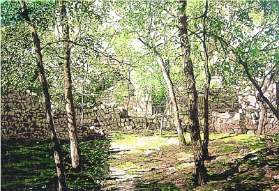 在作品《夏日》中,李聪玲同样用树林和树荫诠释着“热”的主题。画面明暗交错,在阳光的暴晒下,树叶仿佛被烤干,泛黄发脆,失掉水分的树干则起了皮,一碰便会剥落。树荫下,绿色的地衣在悄无声息地内卷,露出斑驳的黄土块。横贯近景远景之间的,是一片残垣断壁,它将画面分作两个层次,当观者想要去发掘墙后的空间时,不得不将视线穿过繁密的树林和碎砖头的隙缝,而此时,一股盛夏的暑气似乎从画中毛细血管一般细密的笔触以及版画特有的干燥感中蒸腾而出,弥散无声。