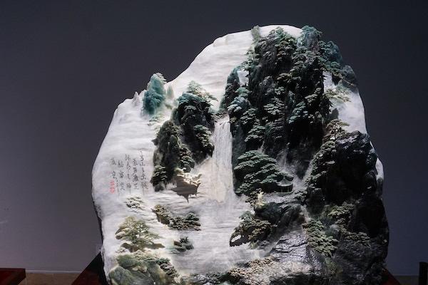 在岫岩玉文化中,也可以看到东北当地在推出地方特色和民族特色所做出的努力,如现场中展出的一位艺术家雕刻的体现着东北的皑皑白雪和雾凇以及大雪覆盖的房屋等展现地方特色的玉雕。
