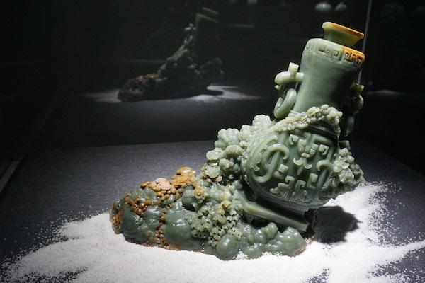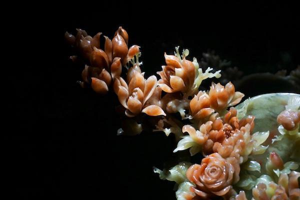 一件“因材施教”的体现素活工艺的作品现场也展出多件“花玉”作品,所谓花玉,是指主要出产自岫岩县西北部的哈达碑镇玉石村的中心矿内,较为稀有,质地较软,因色彩斑斓艳丽而著称。