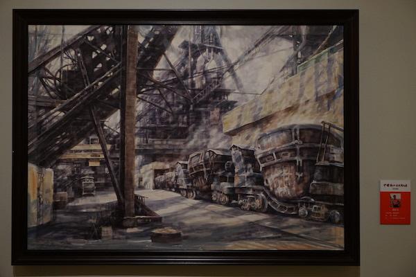 现场展出的描述后工业时代东北倾颓、废弃工厂场景的书画作品