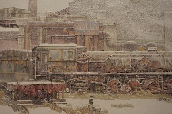 仿“满汉全席”的玉雕美食现场也展出许多书画作品,其中最触动人的是描述着后工业时代东北那些倾颓的、废弃的工厂场景的作品。