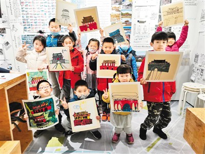 北京中轴线正在进入“申遗”阶段,参加“四名”汇智计划的社会公众也展现了积极参与的态势。11月22日,在位于中轴线区域内的西城德胜城市探索中心,孩子们展示他们以中轴线建筑为主题的创作。