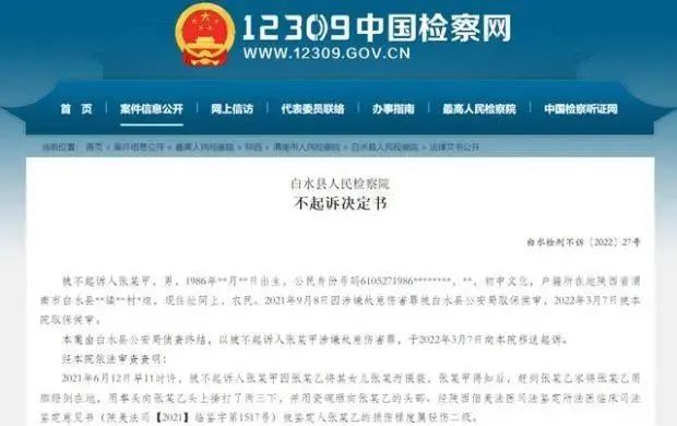 近日,中国检察网公布了一份不起诉决定书。白水县检察院认为,张某甲主动投案,如实供述罪行,自愿认罪认罚,且被害人张某乙有严重过错,综合考虑殴打他人的前因后果、危害程度等,决定对张某甲不起诉。