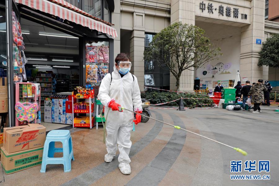 12月11日,工作人员在四川成都市郫都区菠萝社区中铁奥维尔二期小区外消毒周边环境。近日,中铁奥维尔二期、三期小区被调整为中风险地区。