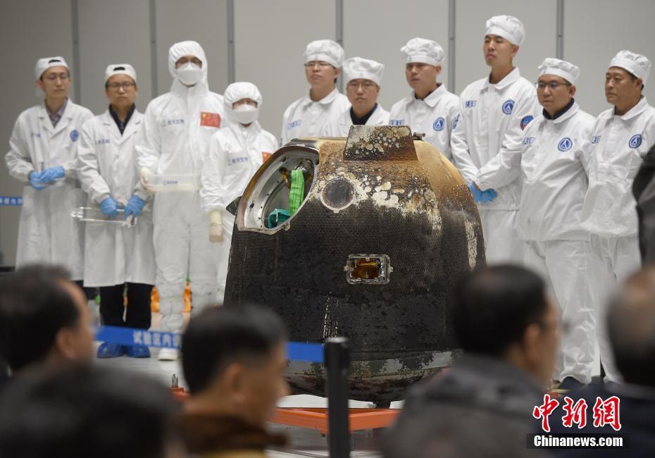 12月19日,重约1731克的嫦娥五号任务月球样品正式交接。这标志着嫦娥五号任务由工程实施阶段正式转入科学研究新阶段,为中国首次地外天体样品储存、分析和研究工作拉开序幕。12月17日晚,嫦娥五号返回器在位于北京的航天科技集团五院(中国空间技术研究院)进行了全面检查。图为17日晚拍摄的等待检查的嫦娥五号返回器。 中新社记者 侯宇 摄