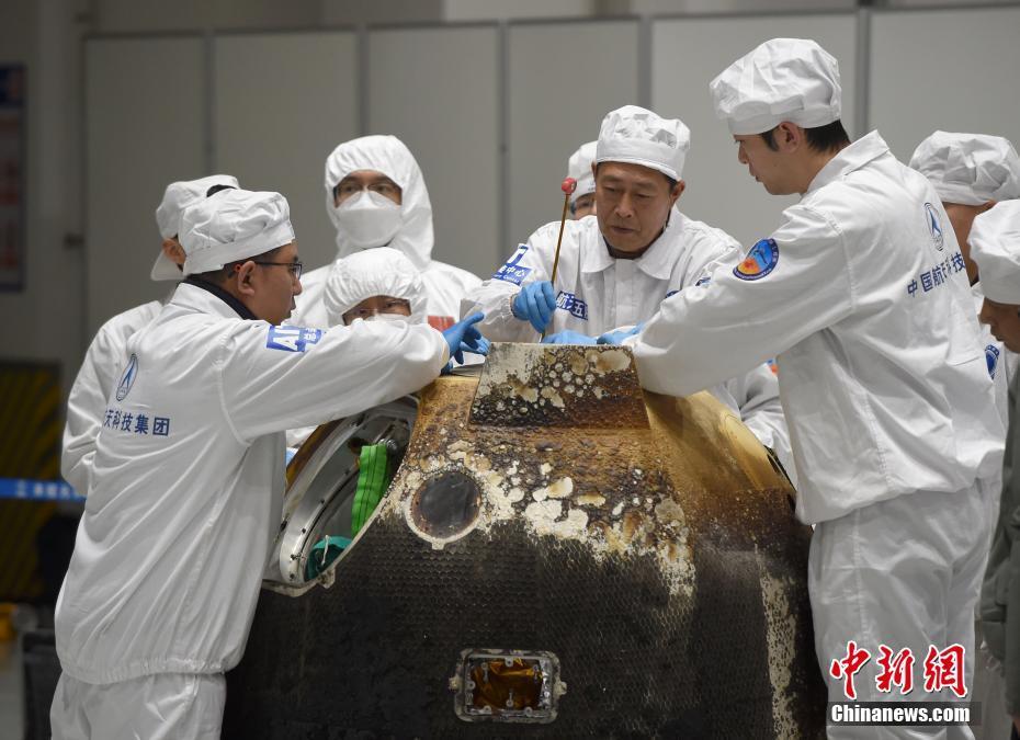 图为17日晚拍摄的工作人员开启嫦娥五号返回器进行检查。 中新社记者 侯宇 摄
