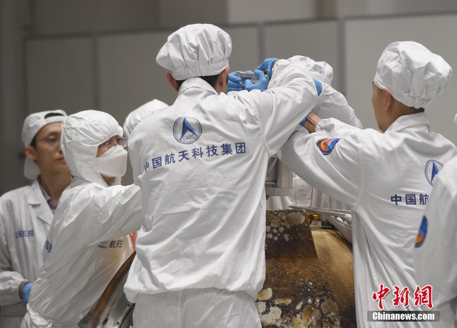 图为17日晚拍摄的工作人员开启嫦娥五号返回器,取出装有月球样品的容器。 中新社记者 侯宇 摄
