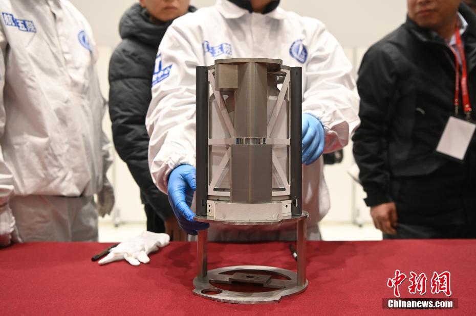 图为17日晚拍摄的从嫦娥五号返回器中取出的装有月球样品的容器。 中新社记者 侯宇 摄