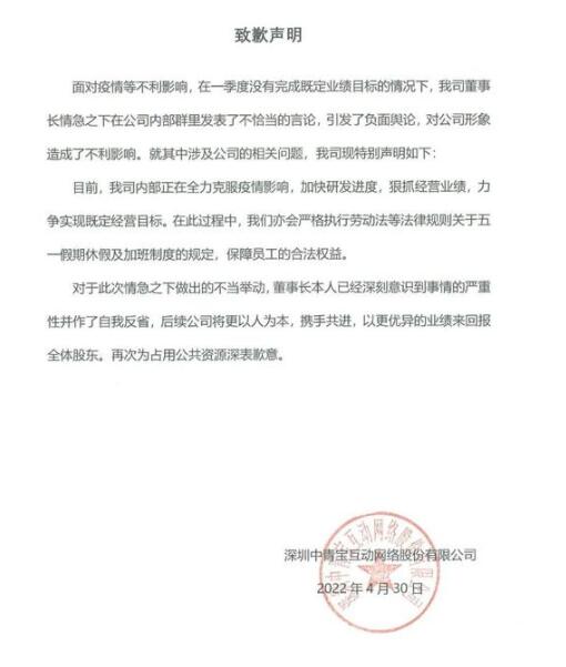 5月1日,中青宝官方微信公众号发布《致歉声明|关于近期公司高管内部群发表不当言论的致歉》。