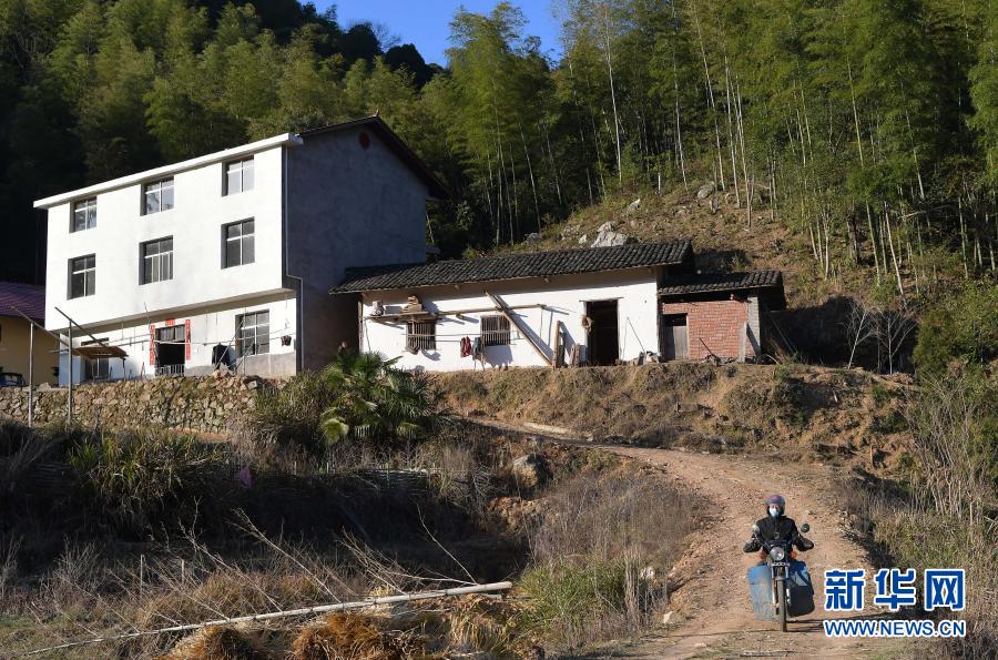 在江西省万载县高村镇新竹村,新竹小学的校长罗长石为学生郭仕钱送完课程之后继续赶路,去下一家送课(2月17日摄)。新华社记者 彭昭之 摄