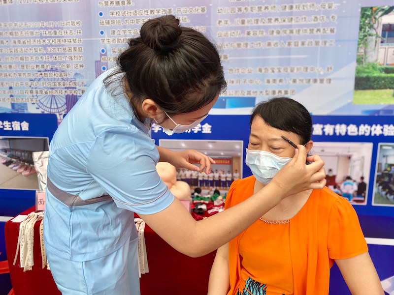 美容美体专业学生为市民提供修眉毛服务。李浩蓉摄