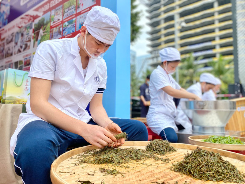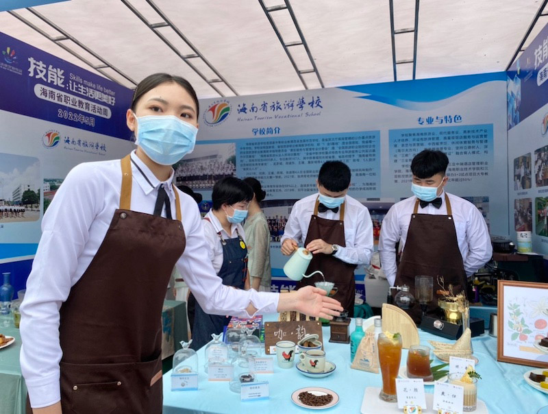 人民网海口5月13日电(李浩蓉)在炒茶灶前细心翻炒茶叶,在餐桌上精雕细琢摆盘水果,在镜头前热情洋溢地直播带货……5月13日,来自海南省的18所职业学校的师生齐聚2022年海南省职业教育活动周, 为市民们展示各自的拿手技能。