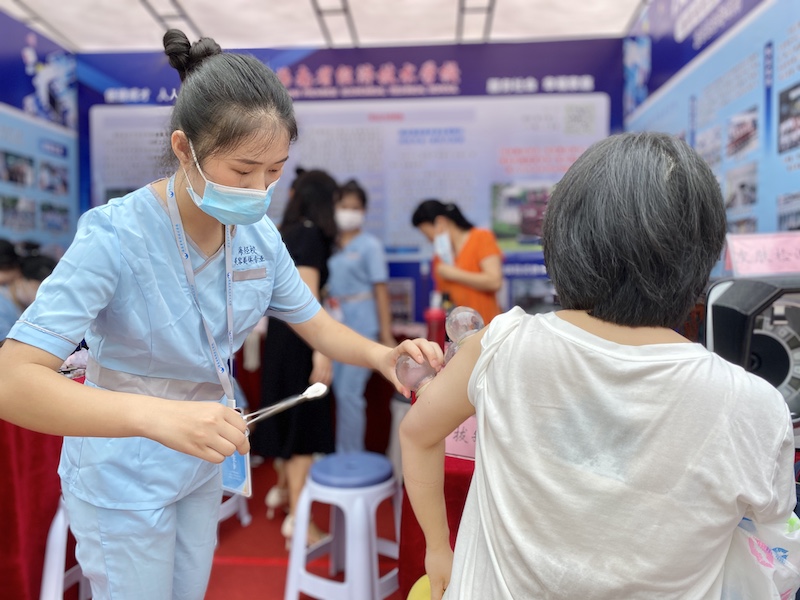 美容美体专业学生正在为体验者拔罐。李浩蓉摄