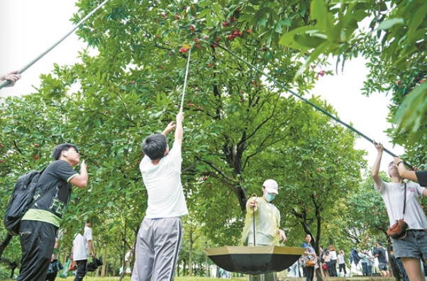 18日,华南理工大学组织开展“鲤工果园收获季”采摘活动。图为师生们在大学城校区采摘芒果和莲雾 羊城晚报记者 梁喻 摄