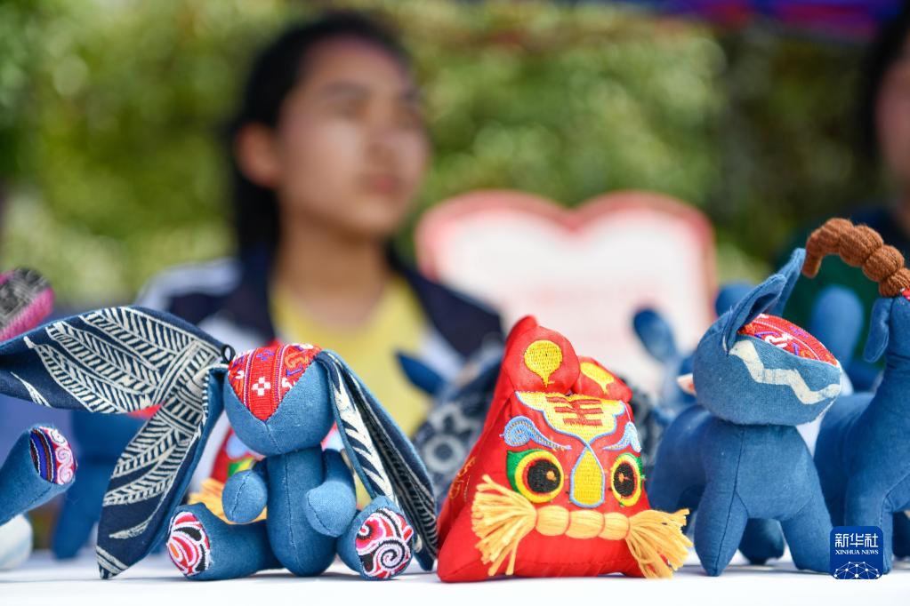 6月26日,贵州省龙里县中等职业学校的学生在展示手工布艺作品。