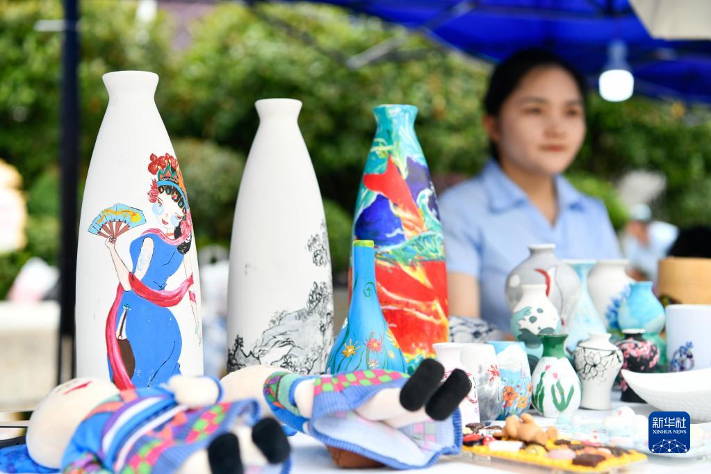 6月26日,贵州省龙里县中等职业学校的老师在展示学生的手工作品。