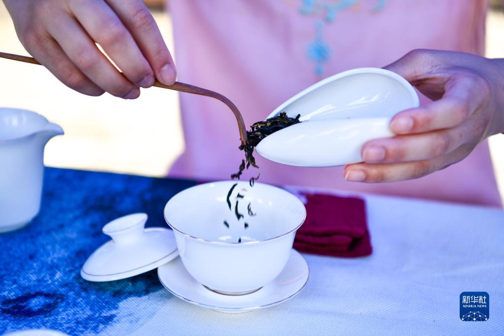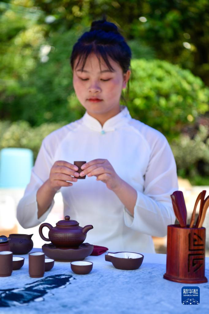 6月26日,贵州省龙里县中等职业学校的学生在展示茶艺。