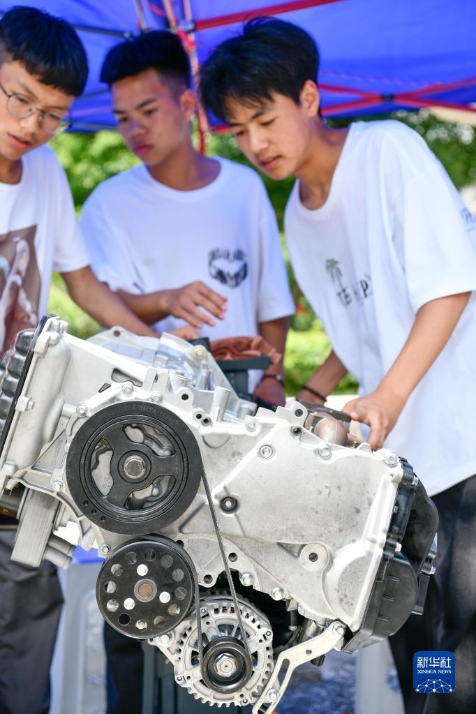6月26日,贵州省龙里县中等职业学校的学生在进行汽车零部件维修技能展示。
