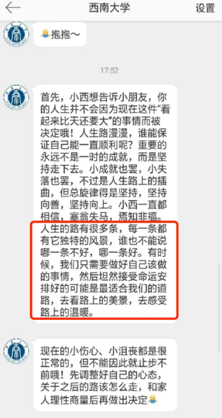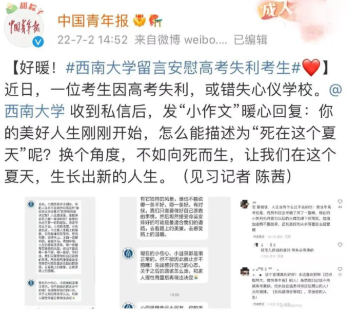 令人意想不到的是,仅过了两个小时,这位考生收到了西南大学官方的回复:“换一个角度,不如向死而生,让我们在这个夏天生长出新的人生”。