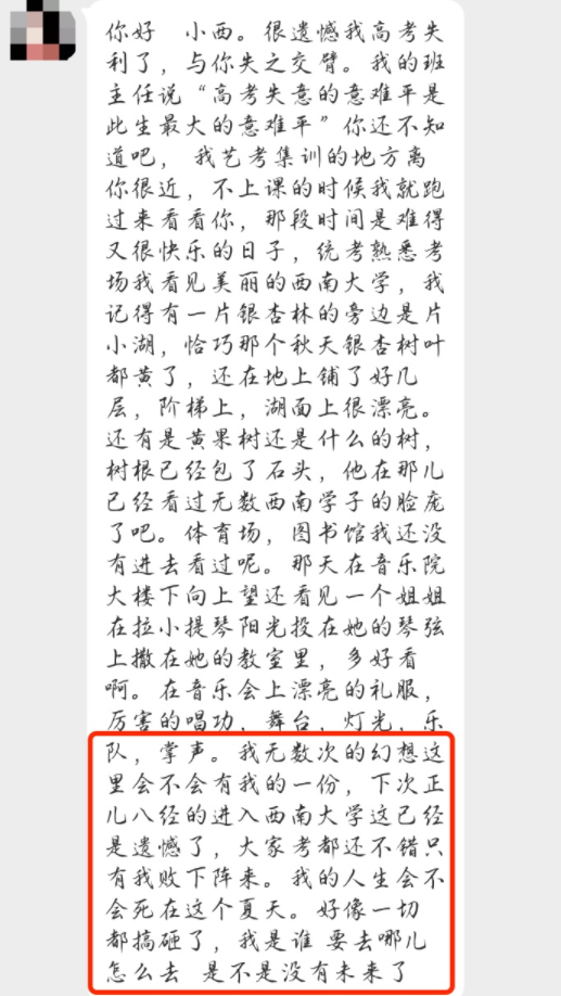 6月24日11点,重庆高考出分,得知分数的考生小邓(化名)感受到巨大的落差。当天,她给心心念念的西南大学写下一段留言:“不上课的时候,我会跑过来看你”,“我无数次幻想着里面会不会有我的一份”?最后,她说——“我是不是没有未来了”?