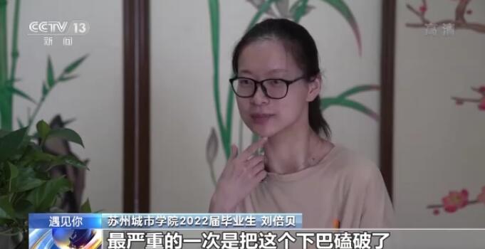 苏州城市学院2022届毕业生 刘倍贝:我走路的话,其实是不稳的。只要遇到什么小石子那种稍微绊一点的东西,我就会摔,最严重的一次是把这个下巴磕破了,缝了大概四五针。