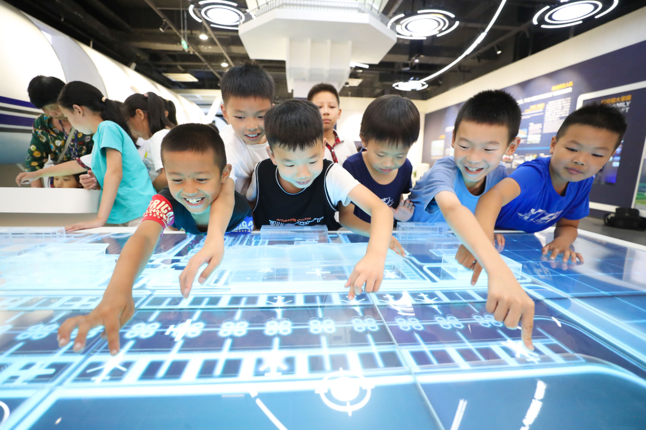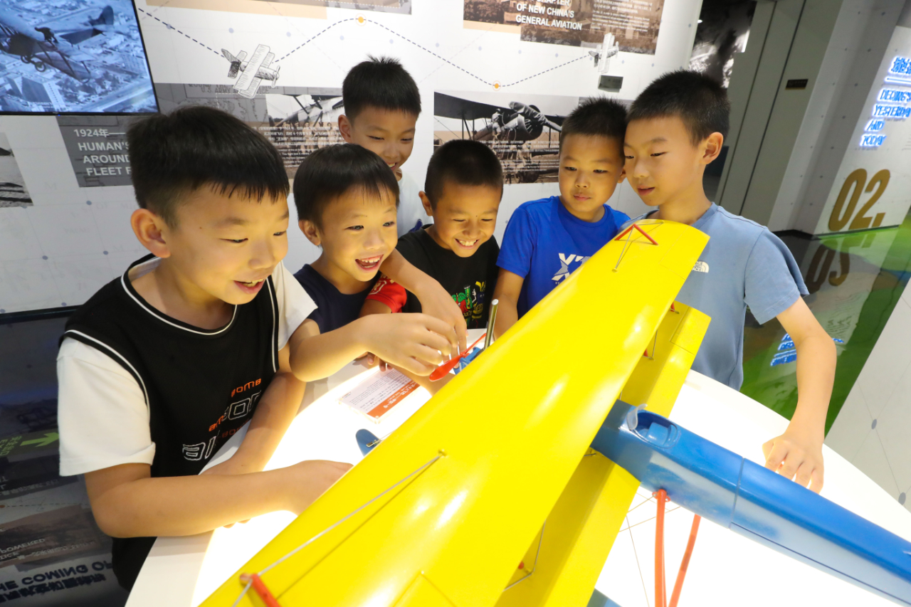 图为在浙江省湖州莫干山高新区的通航智造小镇客厅,雷甸镇的“小候鸟”在参观飞机模型。