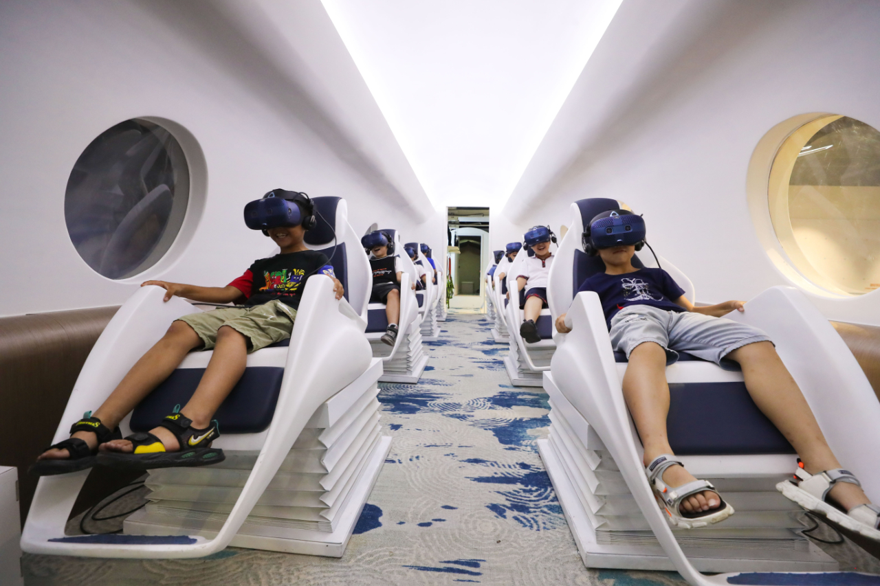 在浙江省湖州莫干山高新区的通航智造小镇客厅,雷甸镇的“小候鸟”在体验VR4D动感影院。